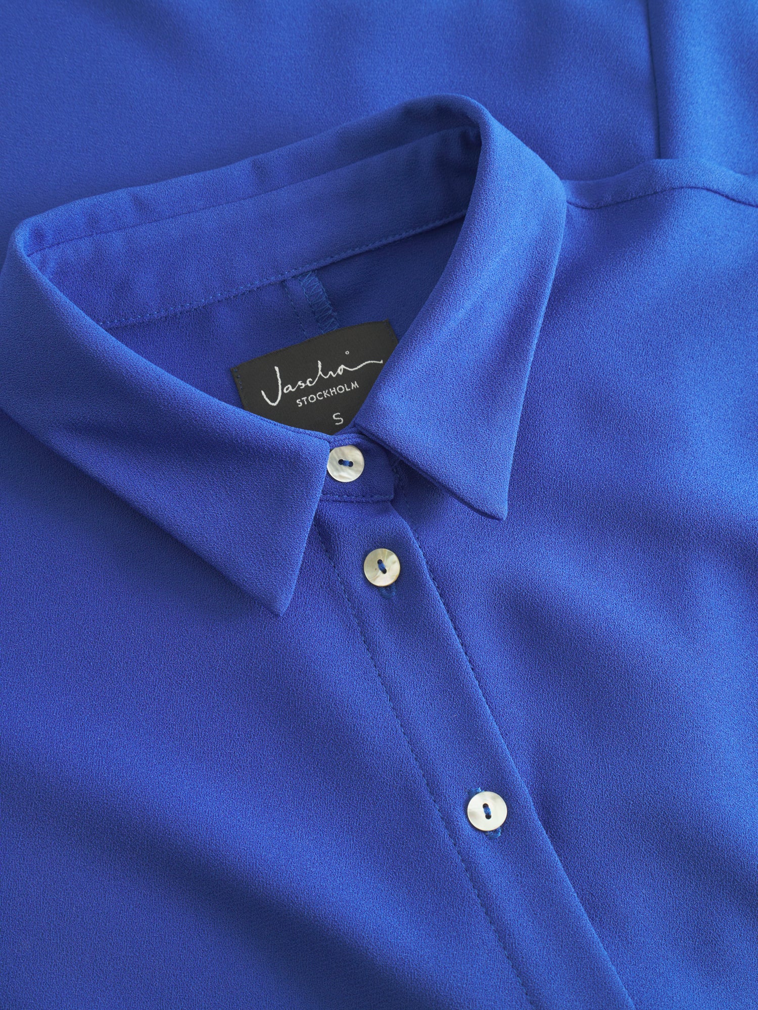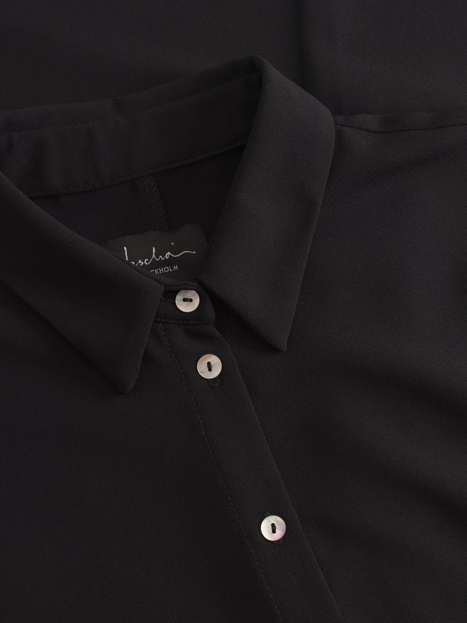 Shirt in soft recycled polyester from Jascha Stockholm. Oversize model with button fastening at the front and three quarter length sleeves. The shirt is a little longer at the back than the front.